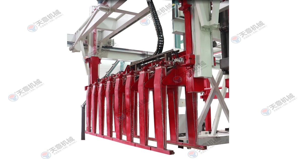 成品分垛吊機:將蒸養(yǎng)車上的一模坯體吊運至掰板輸送機上,然后將空側(cè)板吊運至蒸養(yǎng)車上;切割工段空翻脫模機將模框翻轉(zhuǎn)90°,放在切割小車支座上進行脫模,脫模后的??蚺c清理后的側(cè)模板進行合模,合膜后的空??虮坏?..
