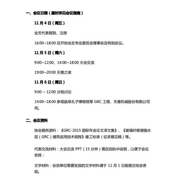 2014 年南京年會以來的新技術(shù)、新材料和新裝備成果;展示上海迪士尼GRC 典型示范工程風(fēng)采;研討 GRC 技術(shù)與產(chǎn)品研發(fā)方向;匯報(bào) 2015 年迪拜國際 GRC 年會及國際 GRC 發(fā)展方向;介紹《玻璃纖維增強(qiáng)水泥(GRC)建筑應(yīng)用技術(shù)規(guī)程》建工標(biāo)準(zhǔn)制定情況;觀摩曲阜孔子博物館等 GRC 工程。為滿足與會者的要求,大會還將特邀相關(guān)部門專家作裝配式建筑發(fā)展導(dǎo)向性報(bào)告。
